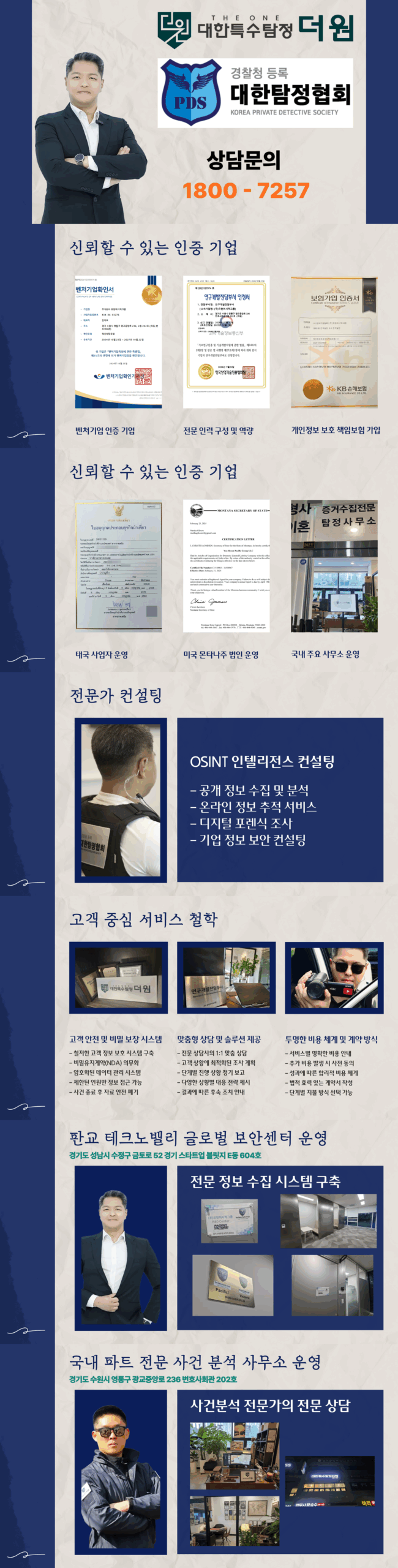 오랜 경험을 통해 축적된 노하우와 전문성을 바탕으로, 의뢰인의 상황에 맞는 맞춤형 솔루션을 제시합니다. 정식 허가를 받은 탐정사무소로서, 모든 업무를 투명하고 합법적인 절차에 따라 진행하며, 의뢰인의 개인 정보 보호를 최우선으로 생각합니다.